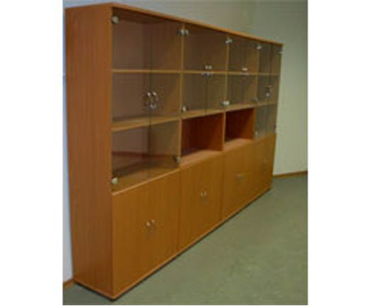 Офисный стеллаж для документов выполняются из ЛДСП 16мм декор: по вашему выбору и облицовываются кромочной лентой ПВХ толщиной 2,0 мм (крышки и щиты нижние, двери) или 0,5 мм. Задние стенки — ДВПО 3 мм белого цвета. Ручки — цельнометаллические или пластиковые. Петли и другая крепежная фурнитура — ведущих европейских производителей. Шкафы комплектуются высокими опорами 50х44, регулируемыми изнутри шкафа или бюджетный вариант цоколь из лдсп(уточняйте при заказе). Для фасадов используется полированное стекло 4 мм или двери из ЛДСП.